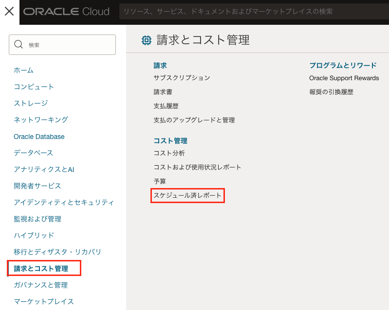 ポリシーの作成後、OCIコンソール画面左上のハンバーガーアイコンから「請求とコスト管理」→コスト管理内の「スケジュール済レポート」を選択します。
