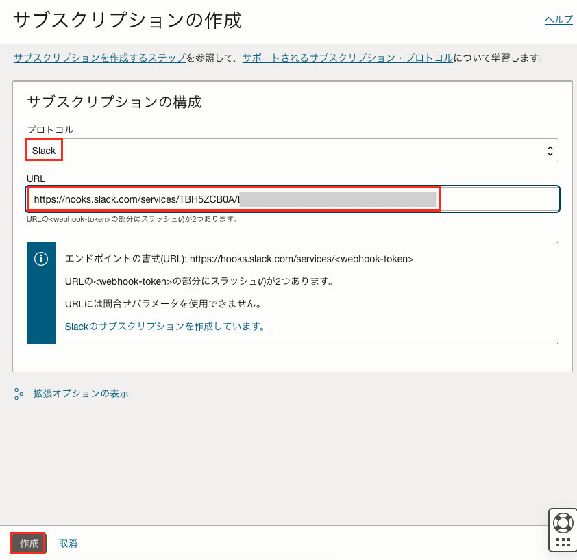 プロトコルには「Slack」を、URLには控えておいたIncoming Webhook用アプリケーションのURLを指定し、「作成」を選択します。