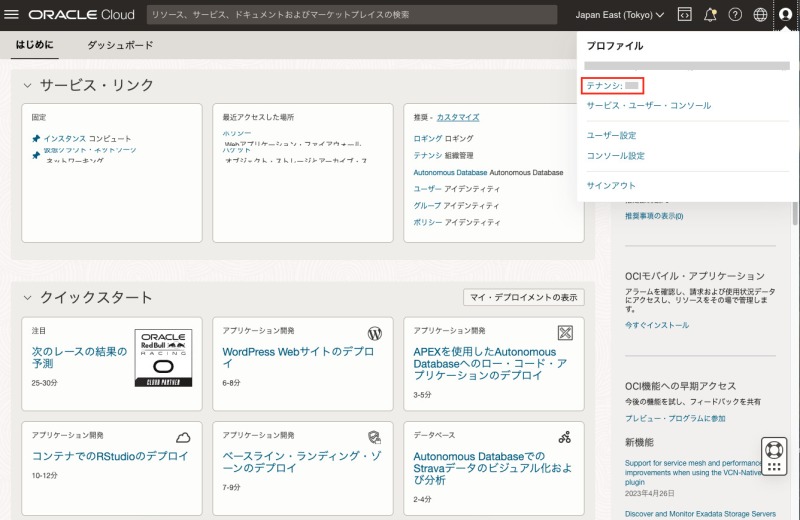 OCIコンソール画面右上の人型アイコンから「テナンシ」を選択します。