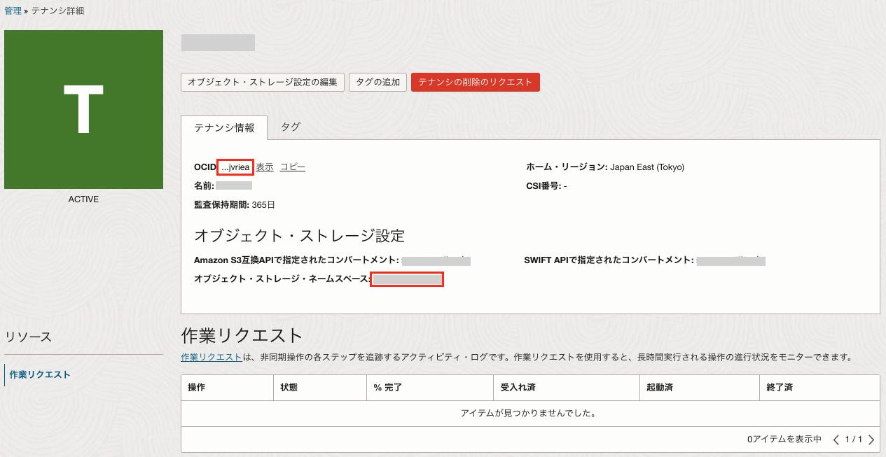 テナンシの詳細画面から、テナンシのOCIDとオブジェクト・ストレージ・ネームスペースをそれぞれ取得しておきます。