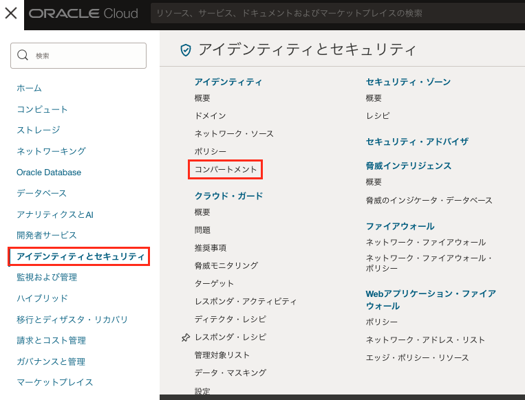 OCIDの取得方法は、OCIコンソール画面左上のハンバーガーアイコンから「アイデンティティとセキュリティ」→「コンパートメント」を選択します。