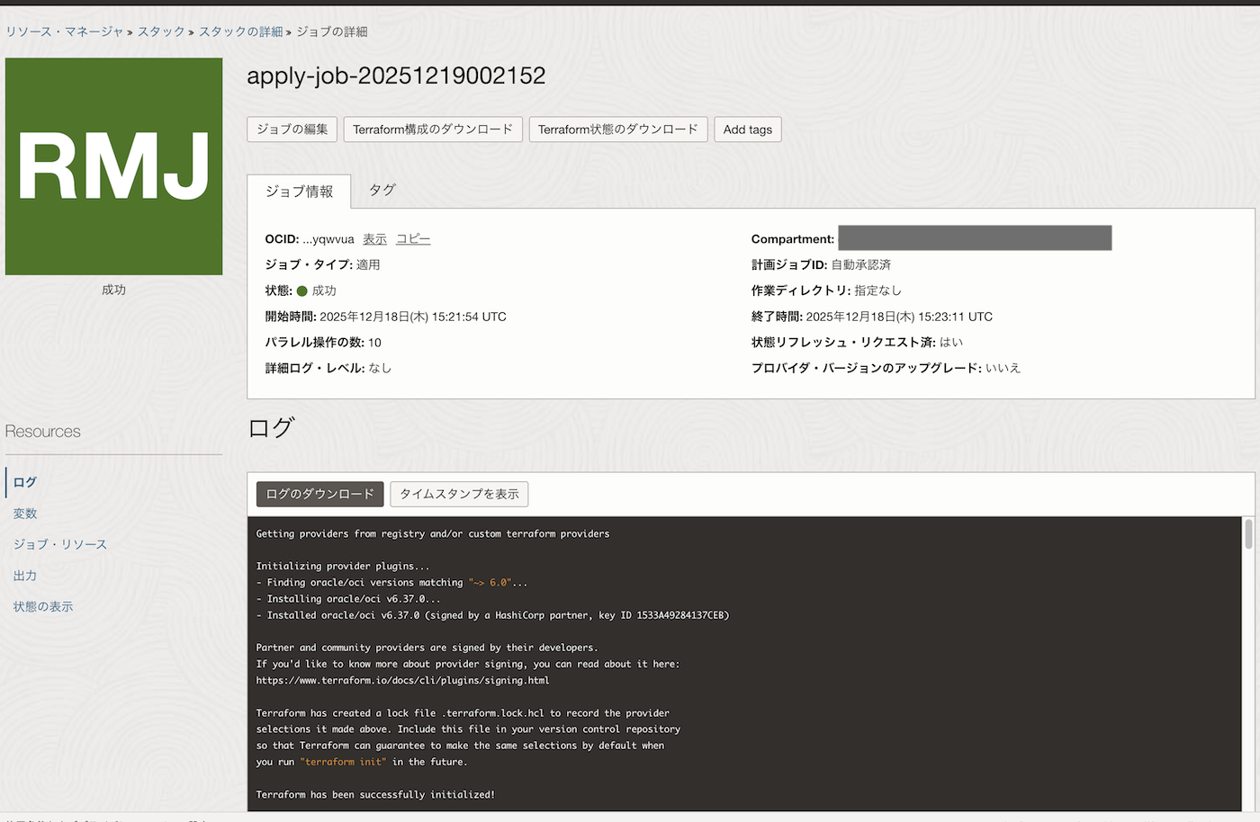 job_id=$(oci resource-manager job create-apply-job --stack-id <リソースマネージャーのスタックOCID> --execution-plan-strategy AUTO_APPROVED --wait-for-state SUCCEEDED --wait-for-state FAILED --query data.id --raw-output)
